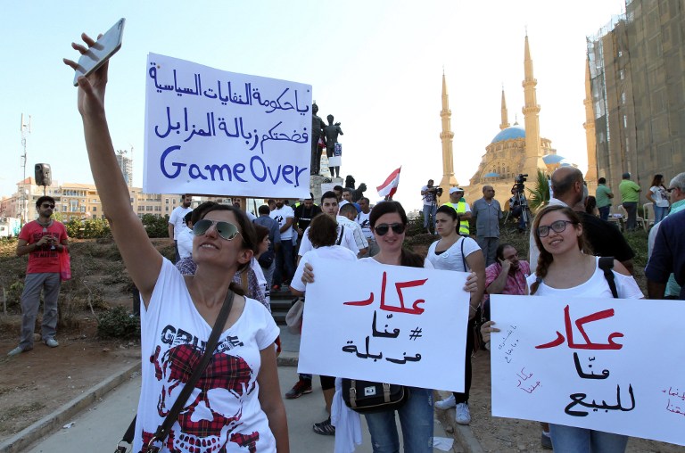 Lebanese young women take pictures as they hold placards before the start of an anti-government protest organised by a civil society frustrated with a political class they see as corrupt and incapable of providing basic services on August 29, 2015 at Beirut’s iconic Martyrs Square. “Today, we’re expecting more than 50,000 protesters,” said Assaad Thebian of the “You Stink” which is stressing the non-partisan nature of the demonstration. The placards read “Akkar is not for sale (C and R) and “Game over you government of political trash”(L). AFP PHOTO / ANWAR AMRO
