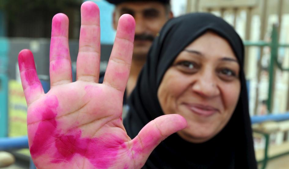A woman shows the ink on her hand after voting during the first phase of the parliamentary elections at a polling station in Giza governorate, Egypt, via Reuters.