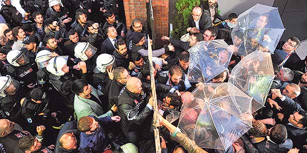 Riot police break the main entrance of the İpek Media Group headquarters in İstanbul during the raid on Wednesday. (Photo: Today’s Zaman)